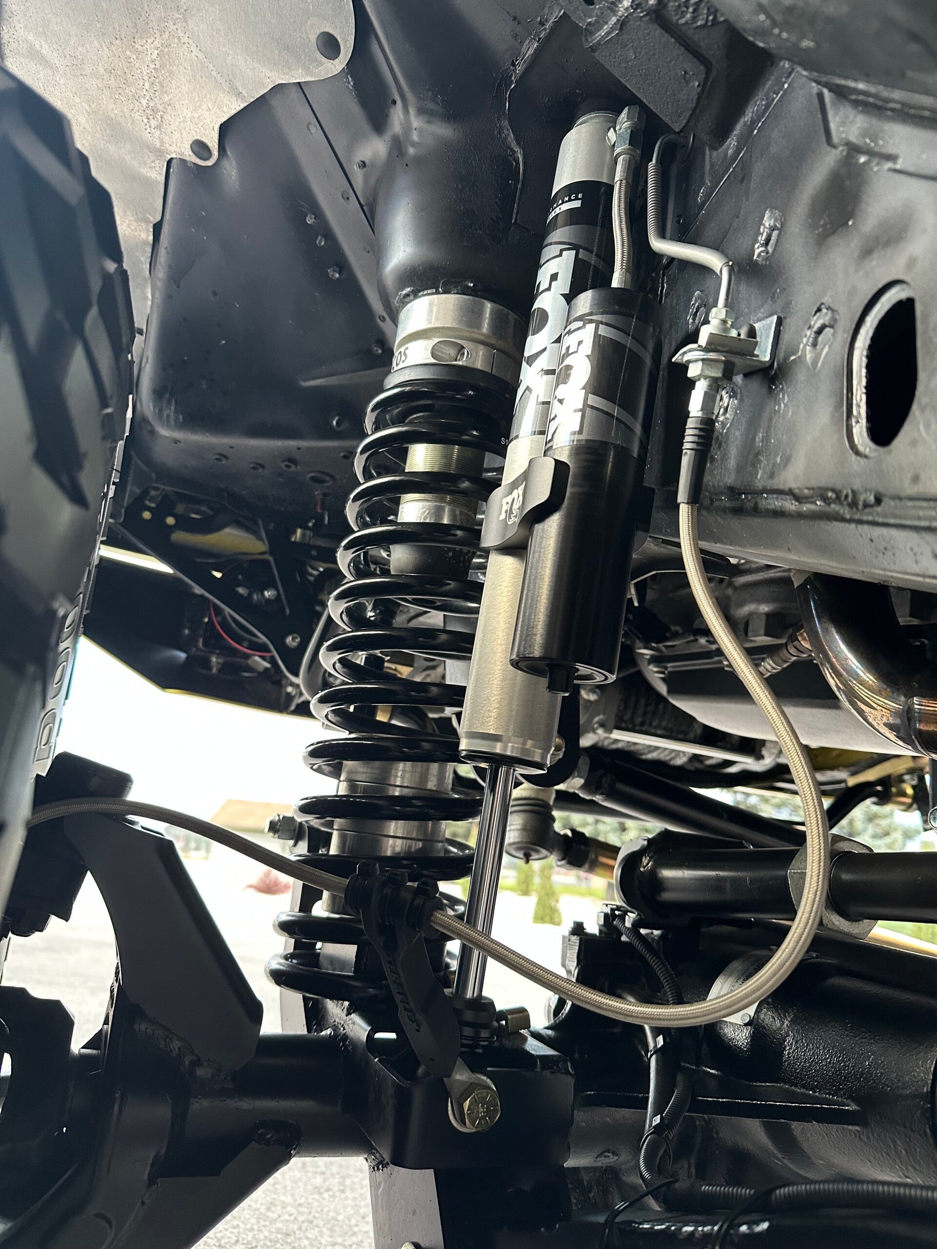 The front suspension is an Ironman 4x4 Fab 4-link with a custom track bar, Clayton springs, ACOS adjustable spacer, and Fox remote reservoir shocks. The rear suspension is a spring-over-axle conversions with new reproduction Comanche leaf springs perched on top of u-bolt eliminator brackets with Fox remote reservoir shocks.